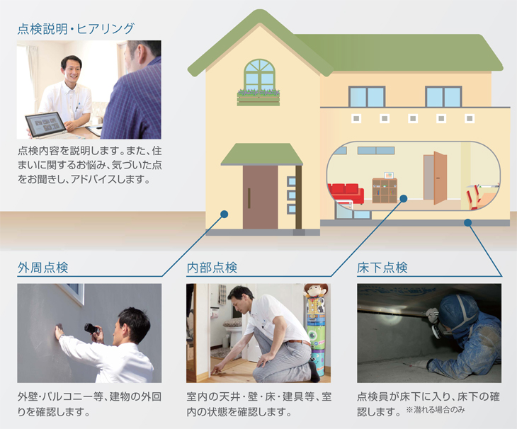 点検前に、検査の目的・検査箇所・検査方法等をご説明いたします。 検査の所要時間は建物の大きさ・床下状況によって異なりますので担当検査員にご確認ください。