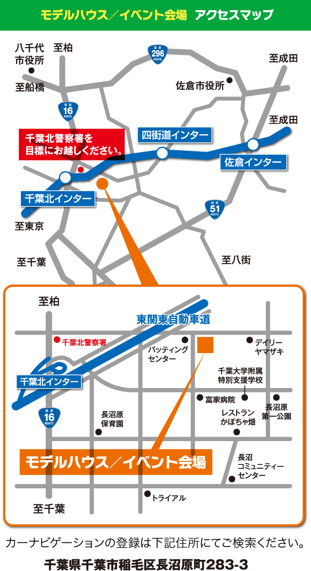 〒263-0001 千葉県千葉市稲毛区長沼原町283-3Tel 043-215-6056 / Fax 043-215-6057 建設業許可 千葉県知事 許可(特-25)第42712号建築士事務所 千葉県知事 登録第1-1509-6472号