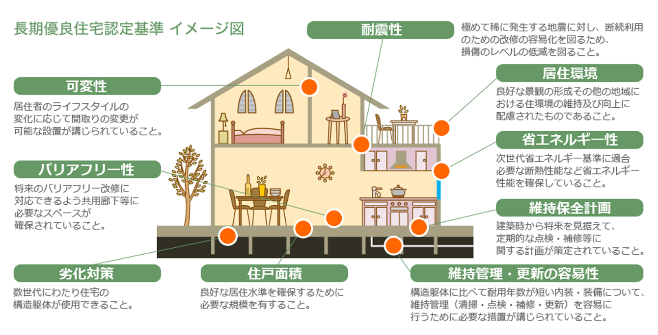 住宅を長期にわたり良好な状態で使用することで、住宅の解体や除去に伴う廃棄物の排出を抑制し、 環境への負担を低減し、建て替えにかかる費用の削減によって住宅に対する負担を軽減し、より豊かで、より優しい暮らしへの転換を図ることを目的としています。