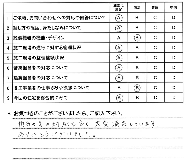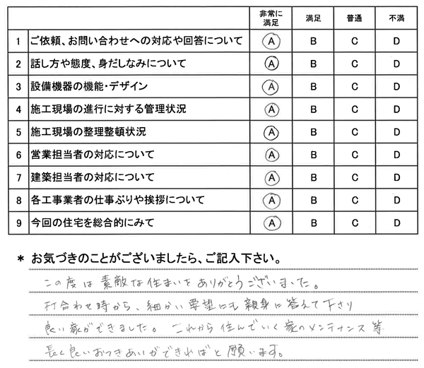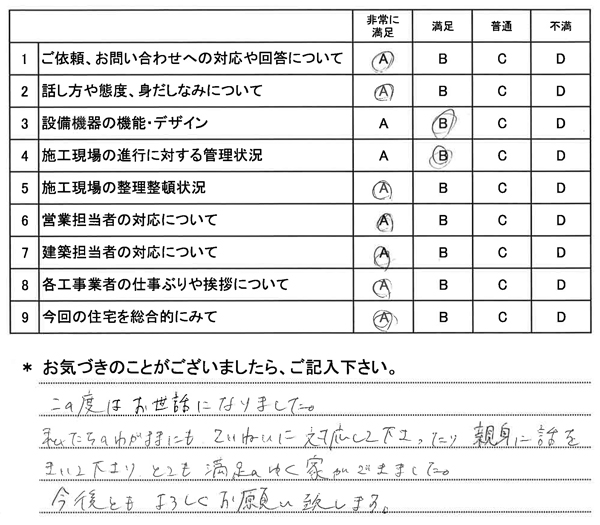 家づくりをお手伝いさせていただいたお客様に満足度アンケートを実施しております。